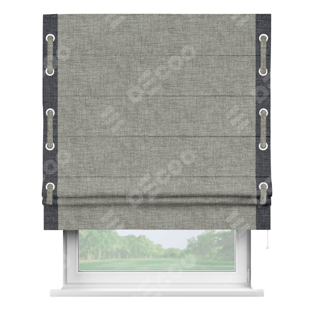 Римская штора пошита из ткани рогожка димаут серый дуб, артикул: 91028, с отделкой кантом «Стрим Дуо», дополненная декоративными люверсами на этих кантах и протянутым пояском из основного цвета римской шторы, представляет собой высоко декоративное и функциональное решение для оконного оформления. Канты, расположенные по обеим боковым сторонам шторы, уже добавляют изысканности и завершенности внешнему виду. Добавление люверсов и пояска не только усиливает декоративный эффект, но и придает шторе дополнительную текстурность и глубину.