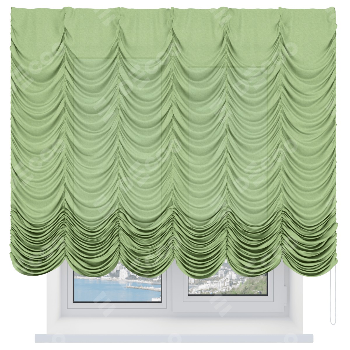 Французская штора производителя «Cortin», используется для проёма, пошита из ткани лён зелёный, артикул ткани 85906. Имеет универсальный механизм и подходит для монтажа: на потолок и на стену.
