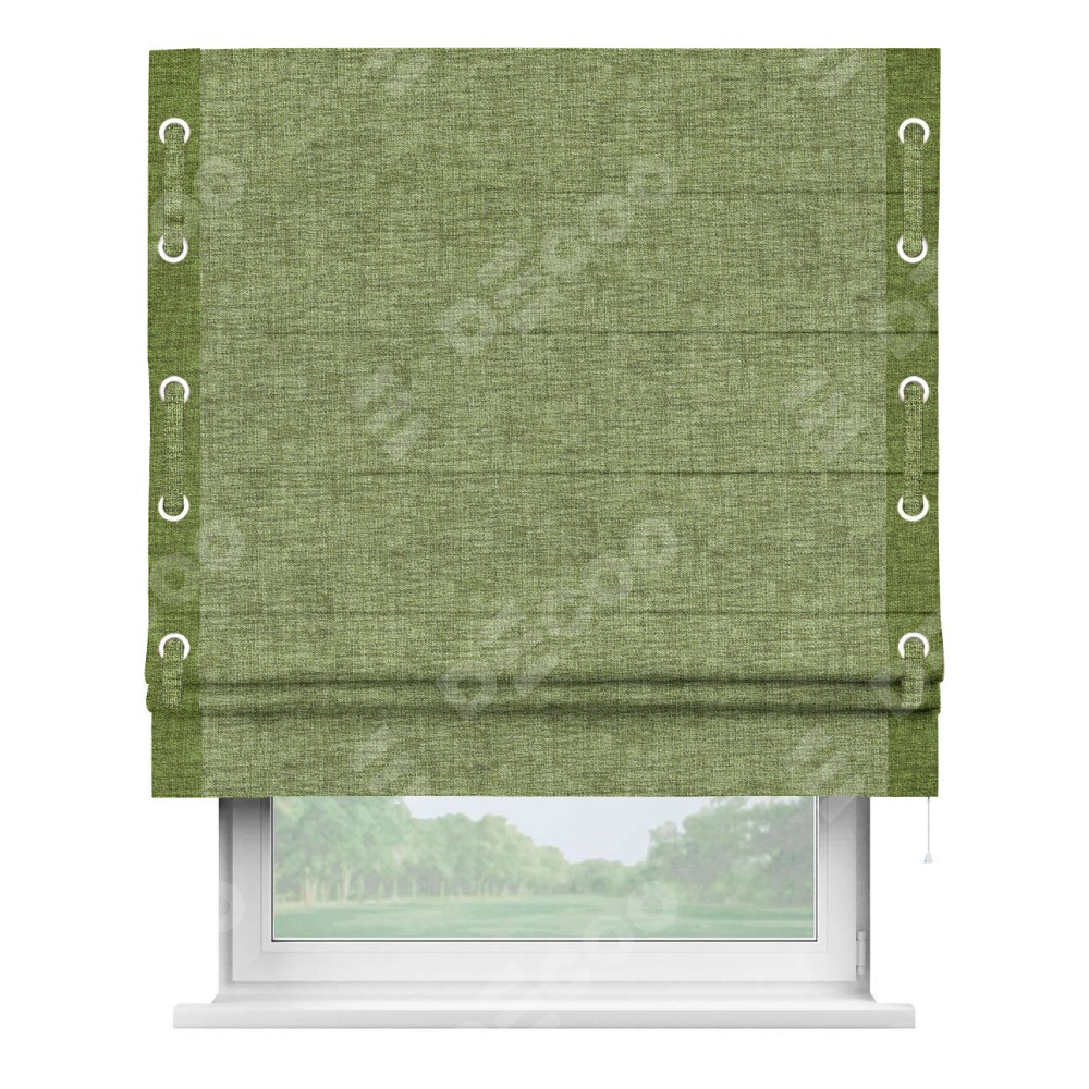 Римская штора «Кортин» для проёма, рогожка димаут травяной, с кантом Стрим Дуо (люверсы с пояском)