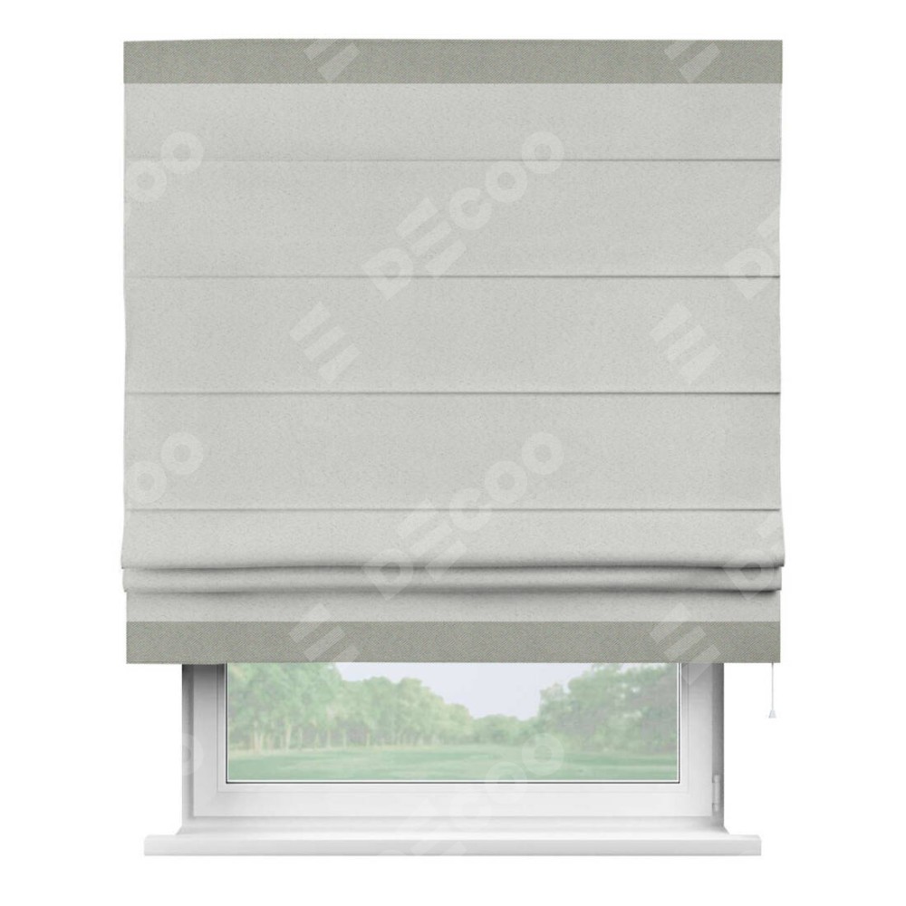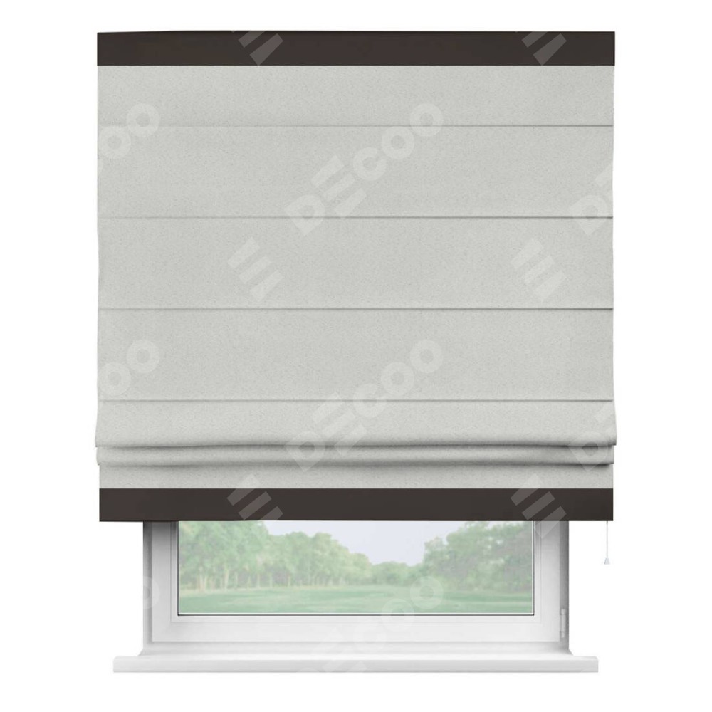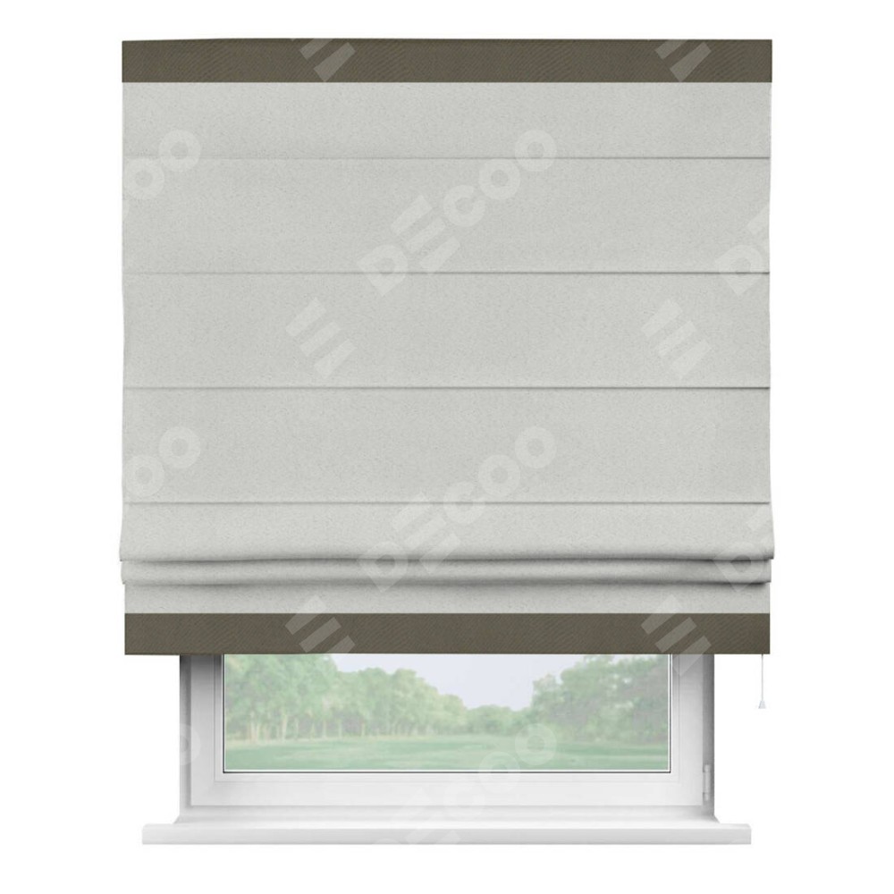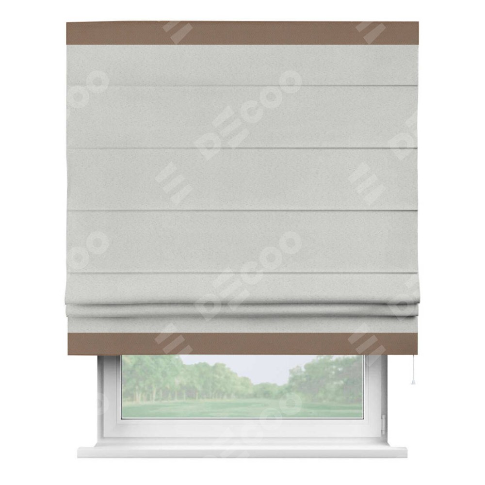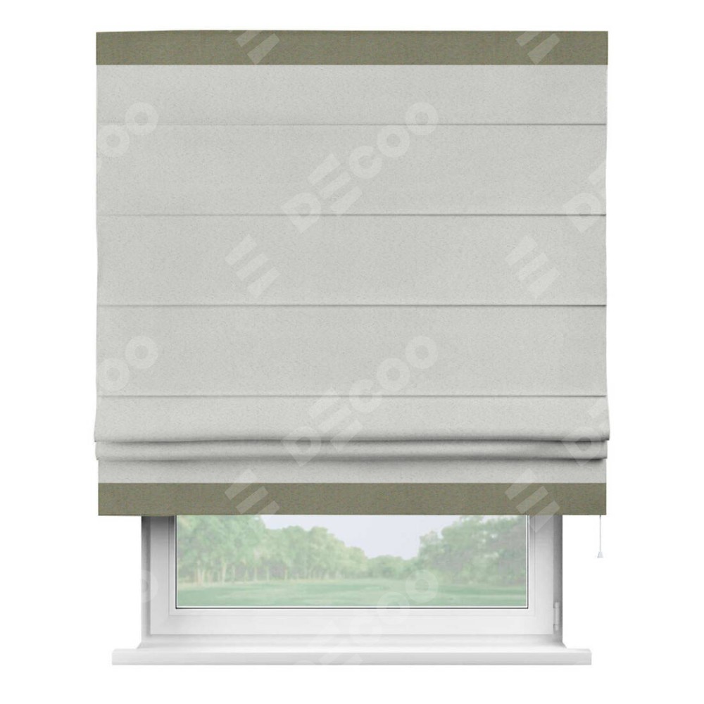 Римская штора пошита из ткани однотонный блэкаут милк, артикул: 23, с отделкой кантом «Горизонт» предлагает уникальное дизайнерское решение, при котором кант располагается только вверху и снизу шторы. Такое решение делает акцент на горизонтальных линиях, визуально расширяя пространство и придавая окну более строгий и организованный вид. Отделка кантом в этих ключевых местах не только украшает штору, но и способствует её долговечности, защищая наиболее уязвимые к износу края.