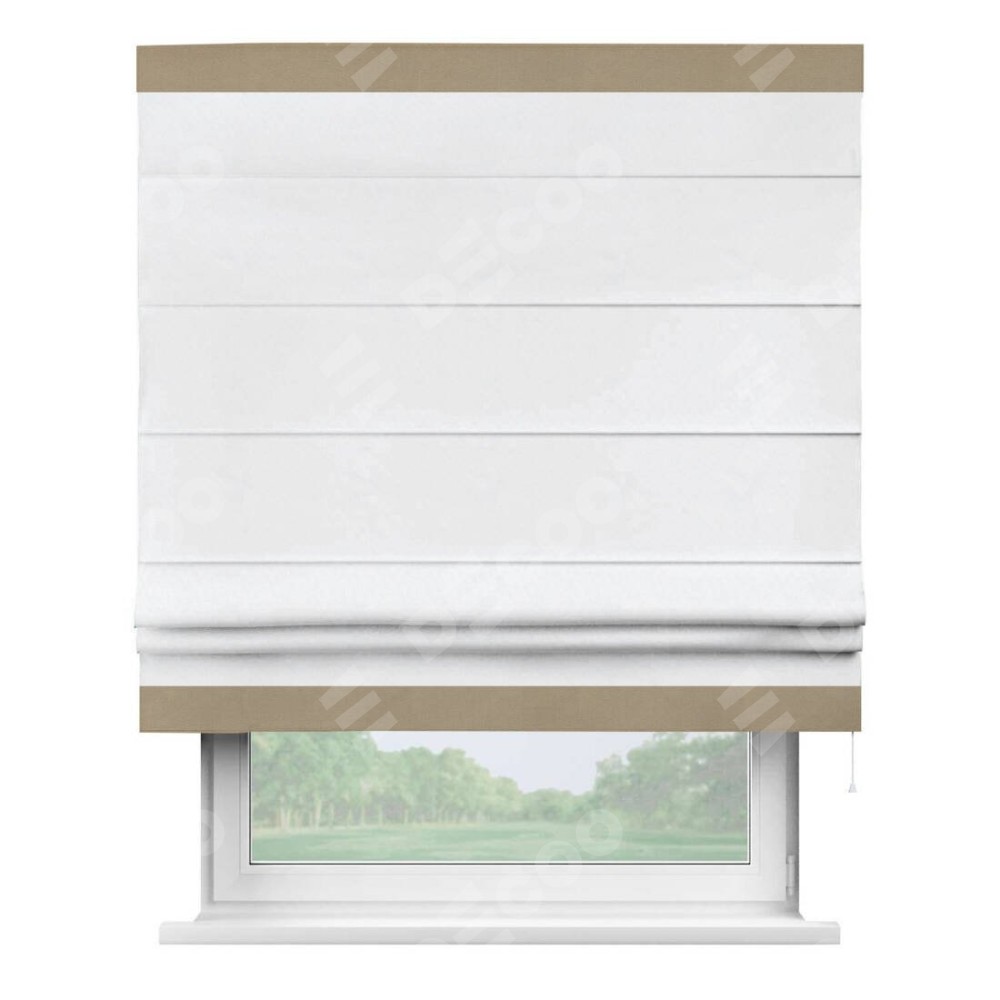 Римская штора пошита из ткани вельвет белоснежный, артикул: 92698, с отделкой кантом «Горизонт» предлагает уникальное дизайнерское решение, при котором кант располагается только вверху и снизу шторы. Такое решение делает акцент на горизонтальных линиях, визуально расширяя пространство и придавая окну более строгий и организованный вид. Отделка кантом в этих ключевых местах не только украшает штору, но и способствует её долговечности, защищая наиболее уязвимые к износу края.