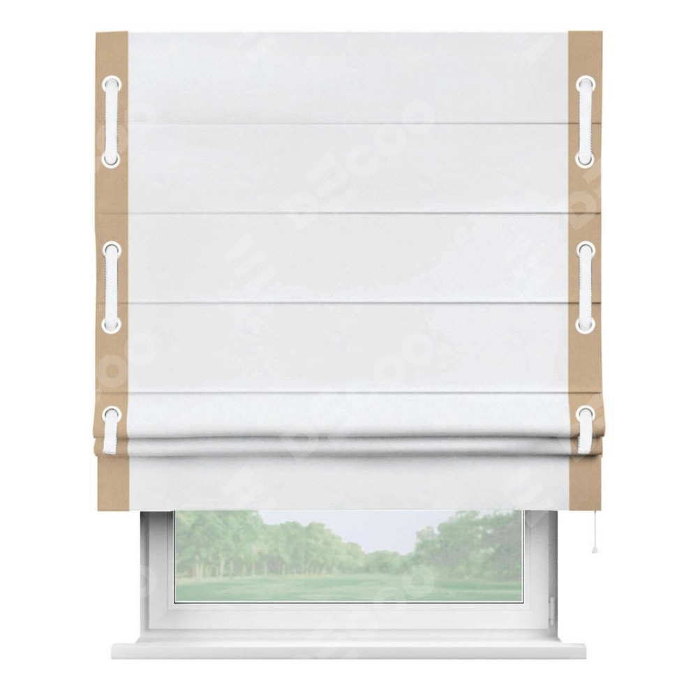 Римская штора пошита из ткани вельвет белоснежный, артикул: 92698, с отделкой кантом «Стрим Дуо», дополненная декоративными люверсами на этих кантах и протянутым пояском из основного цвета римской шторы, представляет собой высоко декоративное и функциональное решение для оконного оформления. Канты, расположенные по обеим боковым сторонам шторы, уже добавляют изысканности и завершенности внешнему виду. Добавление люверсов и пояска не только усиливает декоративный эффект, но и придает шторе дополнительную текстурность и глубину.