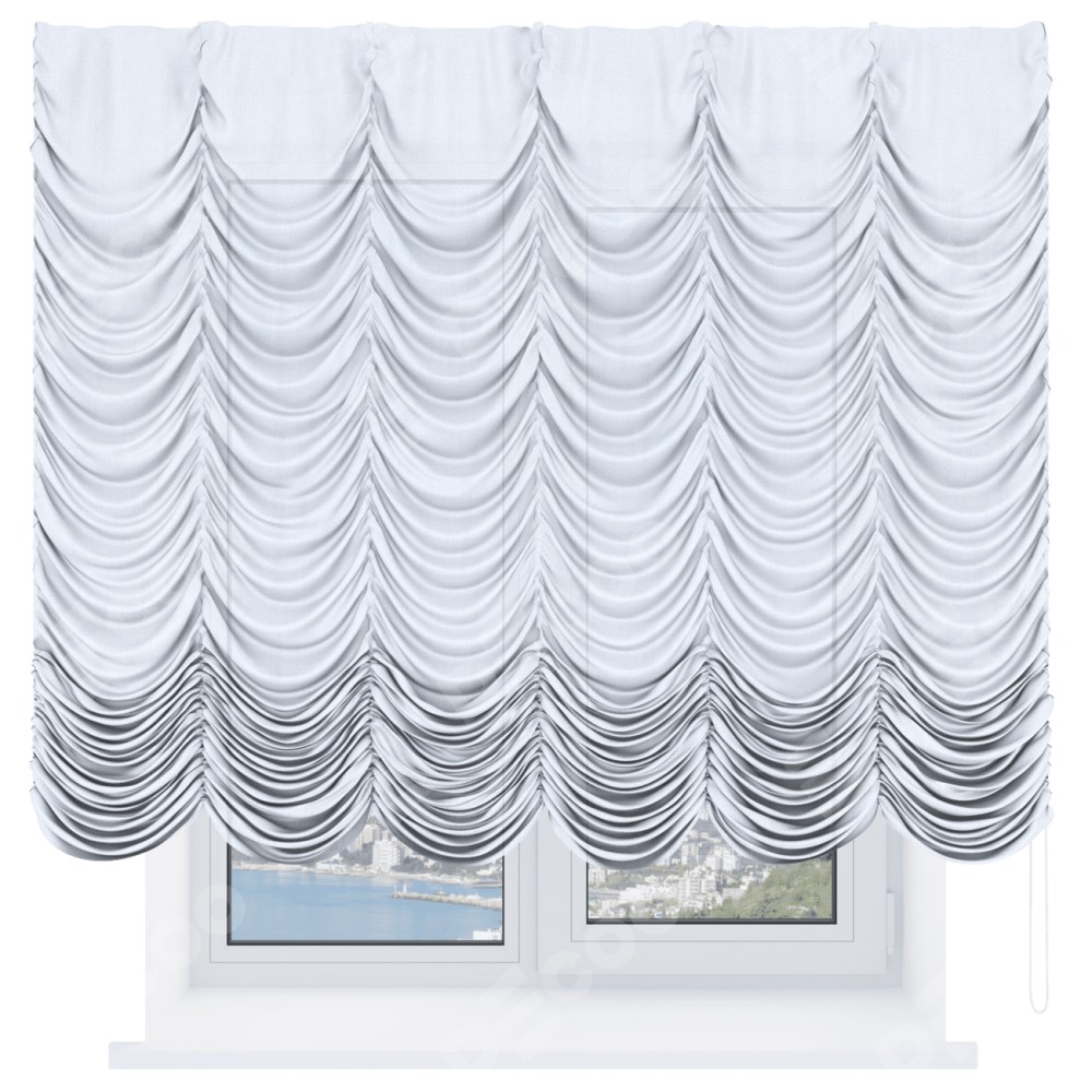 Французская штора производителя «Cortin», используется для проёма, пошита из ткани лён белоснежный, артикул ткани 95632. Имеет универсальный механизм и подходит для монтажа: на потолок и на стену.
