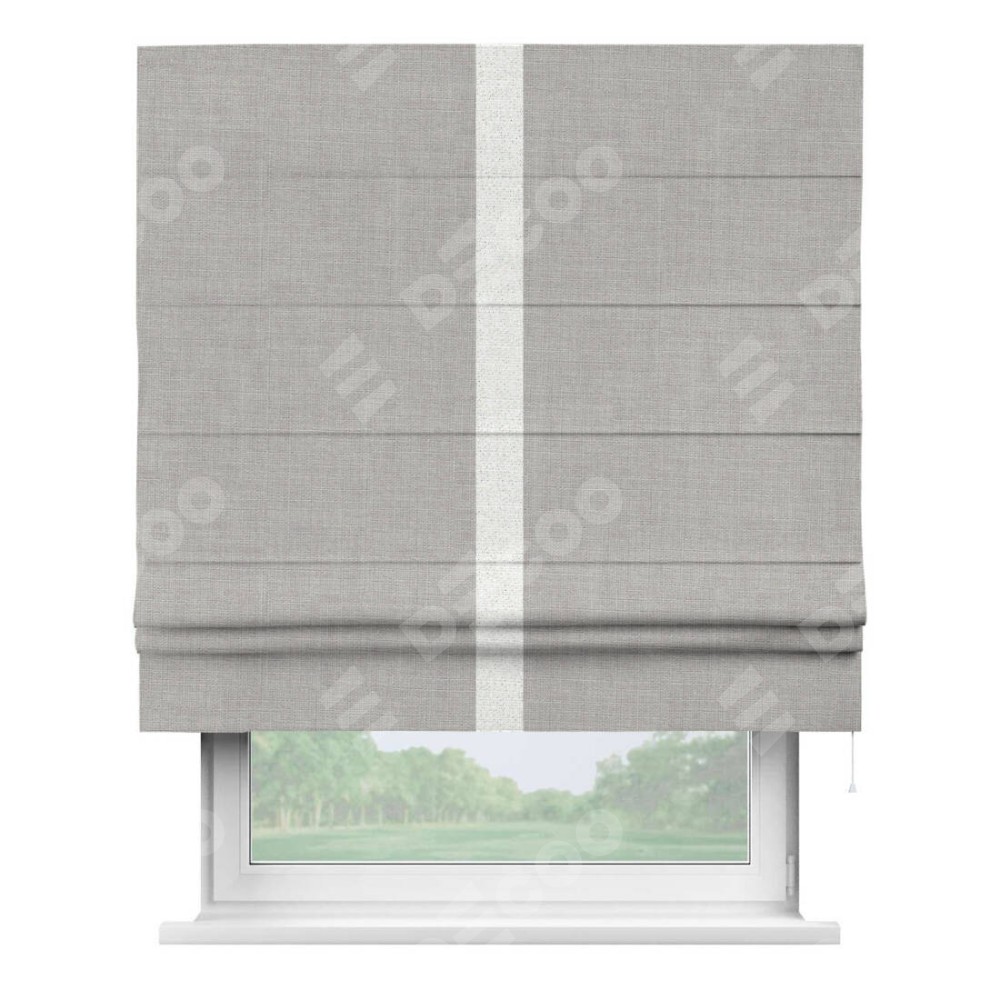 Римская штора пошита из ткани лён серый, артикул: 91410, с отделкой кантом «Хайвэй» представляет собой уникальное и смелое дизайнерское решение, где кант расположен вертикально посередине шторы. Этот дизайн не только выделяет штору среди других вариантов оформления окон, но и создает интересный визуальный акцент, привлекая внимание к центру окна и разделяя штору на визуальные зоны. Такой нестандартный подход добавляет динамичности интерьеру и может быть использован для подчеркивания особенностей оформления помещения.