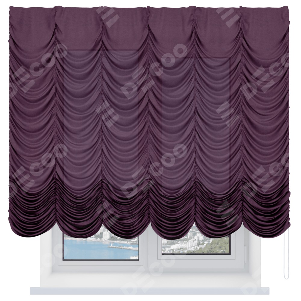 Французская штора производителя «Cortin», используется для проёма, пошита из ткани лён фиолетовый, артикул ткани 85907. Имеет универсальный механизм и подходит для монтажа: на потолок и на стену.
