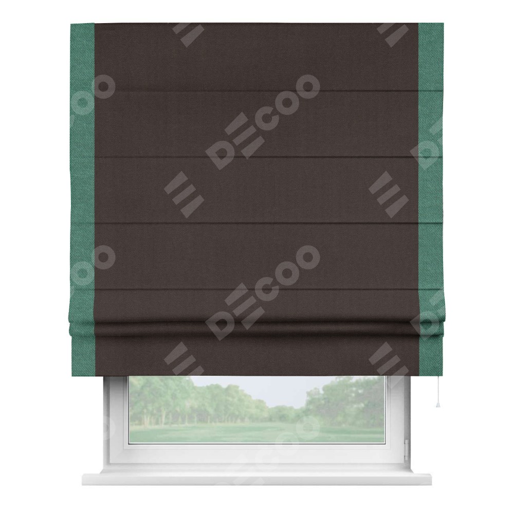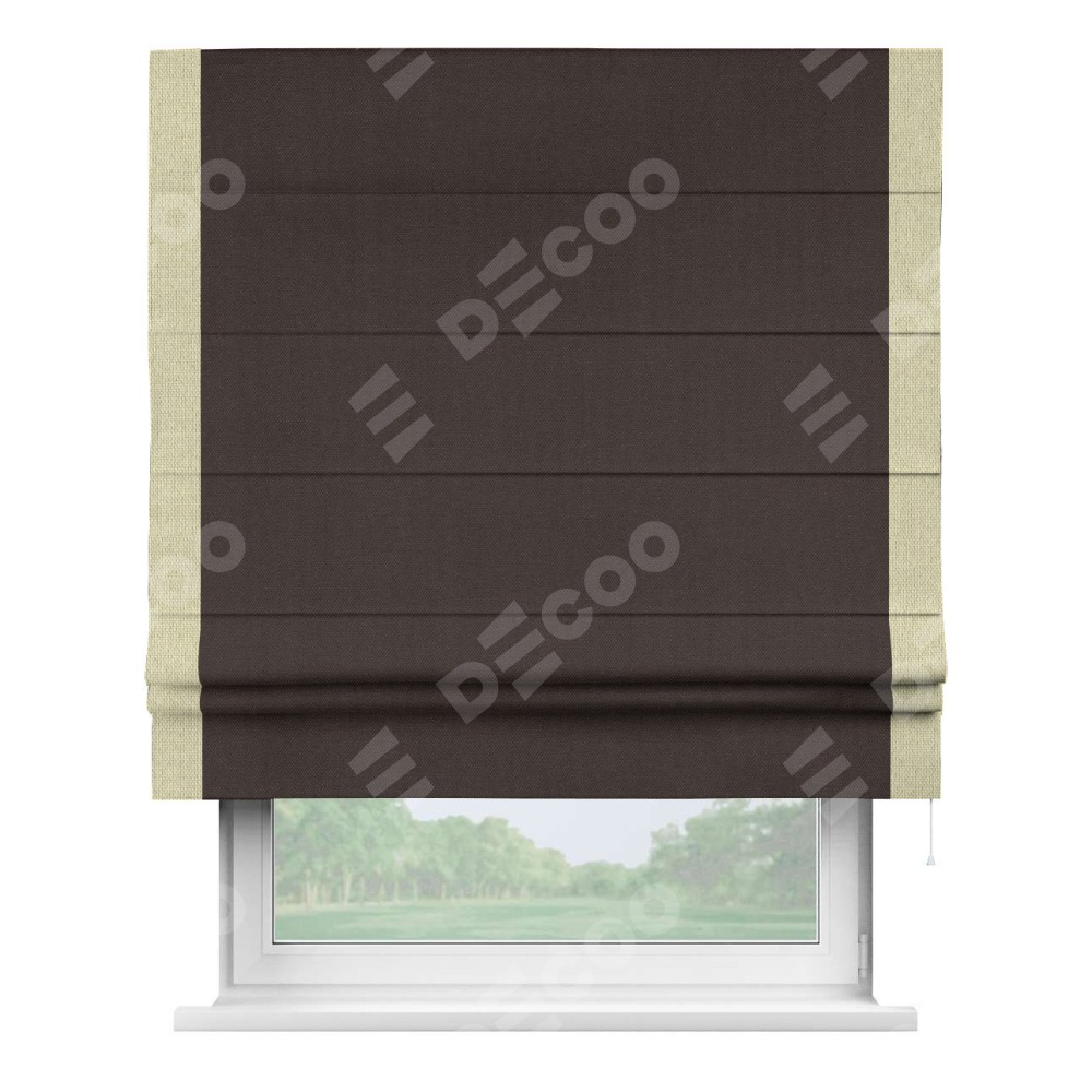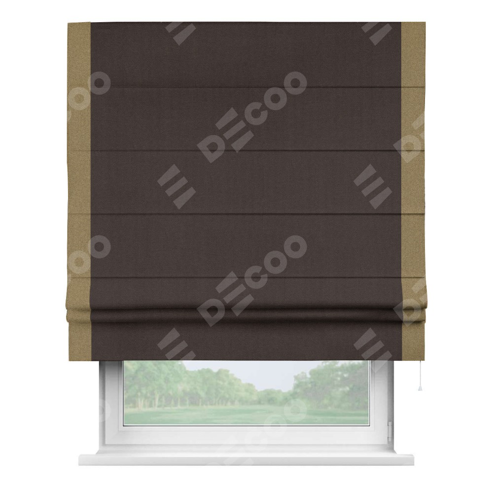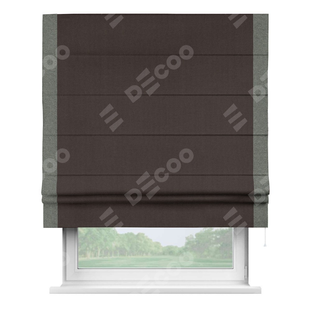 Римская штора пошита из ткани лён димаут венге, артикул: 91001, с отделкой кантом «Стрим Дуо» выделяется наличием кантов по обоим бокам шторы, слева и справа. Этот дизайн придает шторе аккуратный и завершенный вид, акцентируя вертикальные линии и визуально вытягивая окно в высоту. Отделка кантом по бокам не только украшает штору, но и служит практической функцией, укрепляя края и продлевая срок службы изделия.