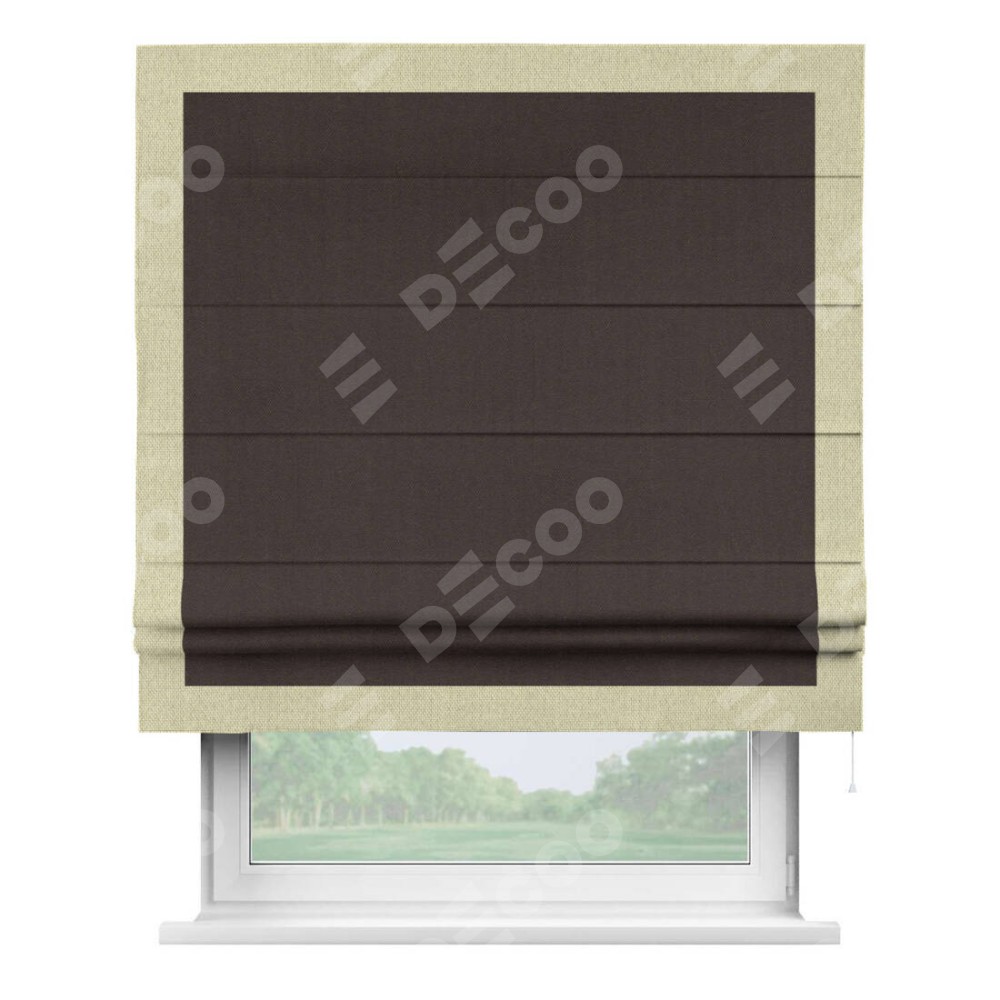 Римская штора пошита из ткани лён димаут венге, артикул: 91001, с отделкой кантом «Чесс» отличается своей уникальной деталью — наличием канта не только по бокам и снизу, но и сверху по всем краям шторы. Это придает шторе особенно аккуратный и завершенный вид, делая акцент на границах и форме шторы. Отделка кантом по всему периметру шторы усиливает её декоративные качества и подчеркивает строгую геометрию, что может быть особенно актуально для современных и минималистичных интерьеров.