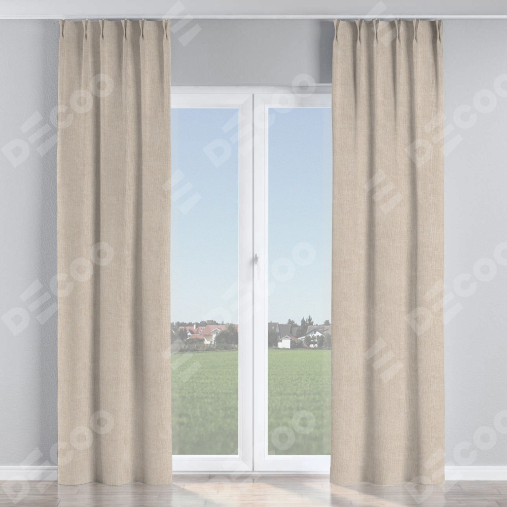 Комплект прямых штор, от производителя «Cortin», пошиты из ткани лён кашемир натуральный беж. С изнаночной стороны в верхней части штор пристрачивается шторная лента с декоративными складками «Кустик». Для создания элегантных складок рекомендуемый коэффициент 1:2 (на 100 см. ширины проёма 200 см. ширины ткани). Важно! Ширина штор указана без учёта коэффициента сборки!