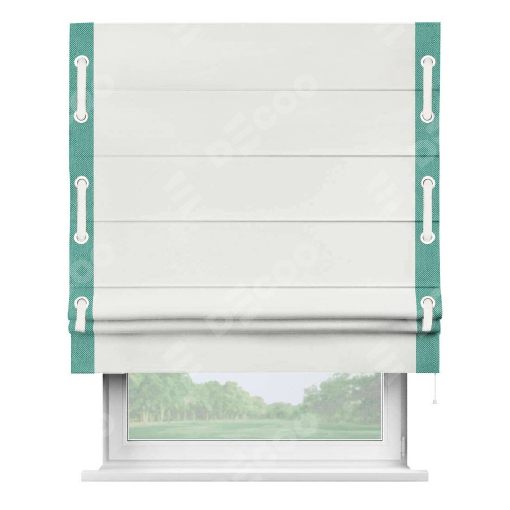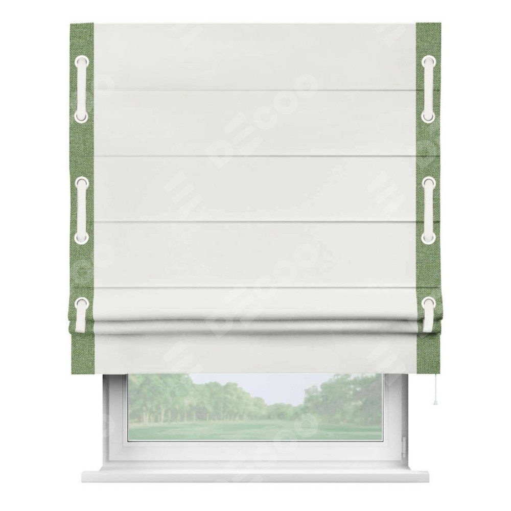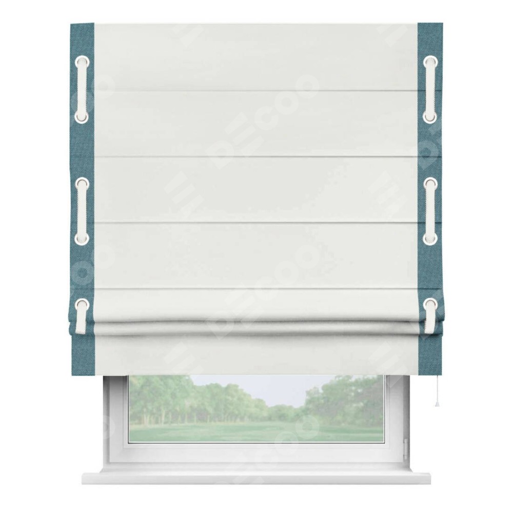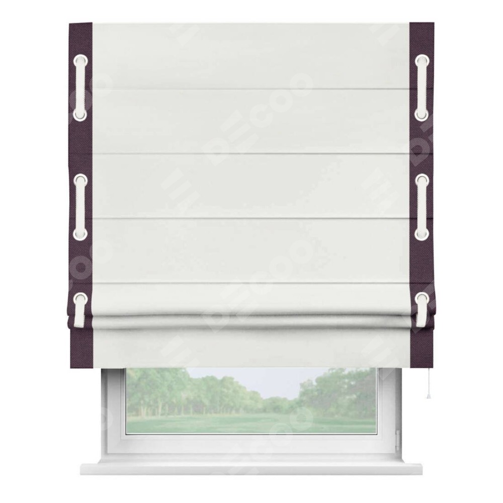Римская штора «Кортин» для проема, лён димаут молочный с кантом Стрим Дуо (люверсы с пояском)