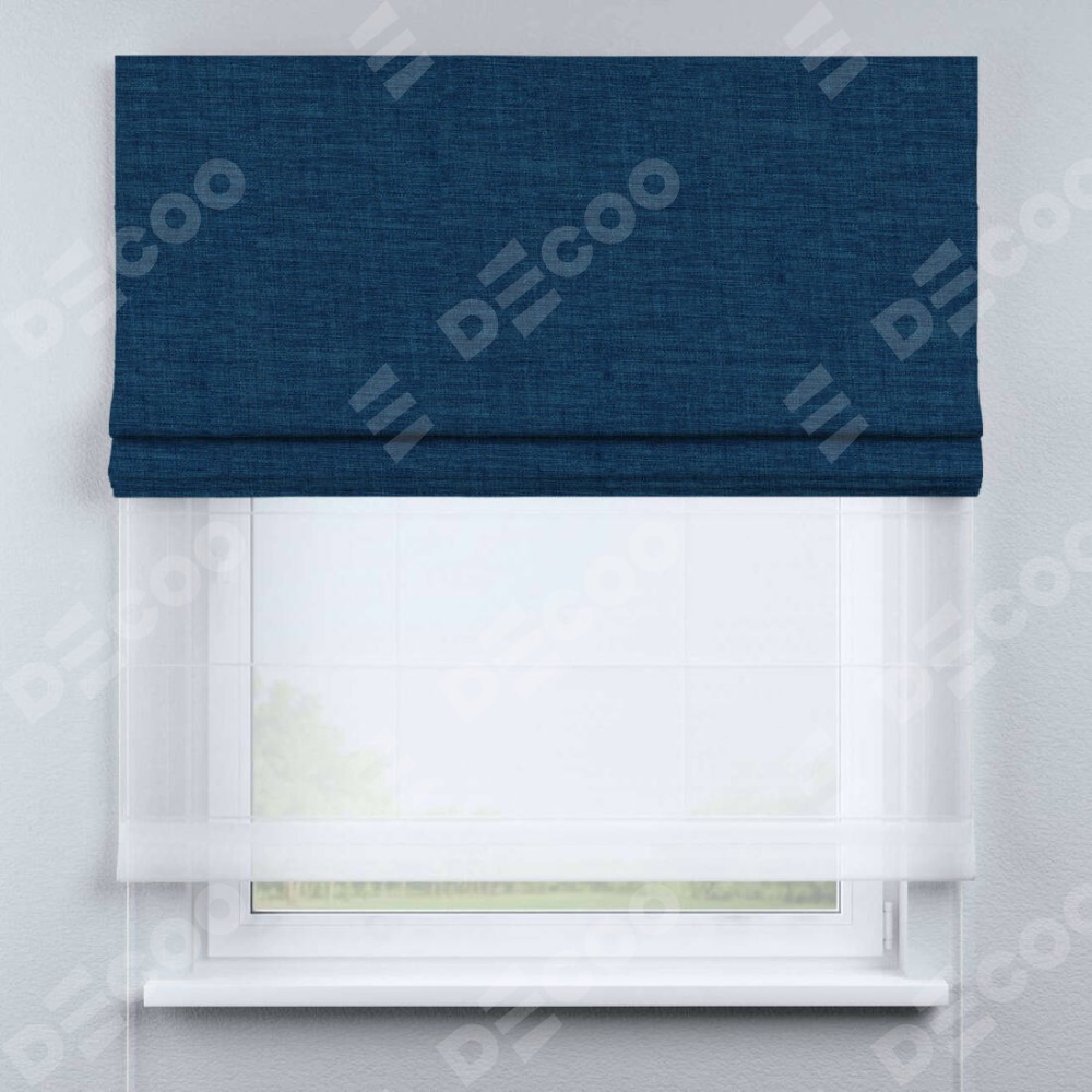 Двойная римская штора «День-ночь» от производителя Cortin предназначена для использования в проёмах. Эта штора уникальна тем, что состоит из двух полотен. На лицевой стороне находится лён синий (артикул: 104496), обеспечивающий эффективное затемнение. В комплект также входит вторая ткань — легкий белый тюль (артикул: V-01), который добавляет изящества и легкости оформлению окна. Кроме того, доступны и другие разновидности ткани тюль, выбор которых доступен по ссылке .