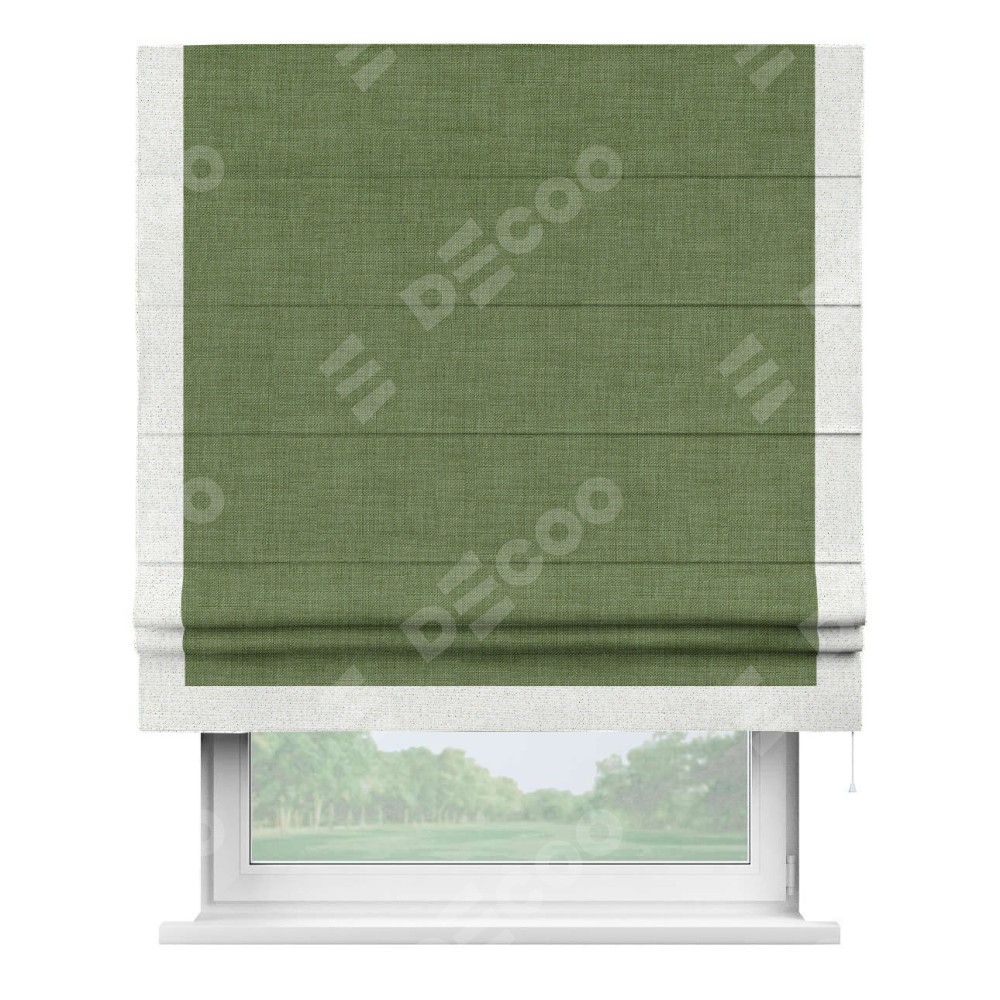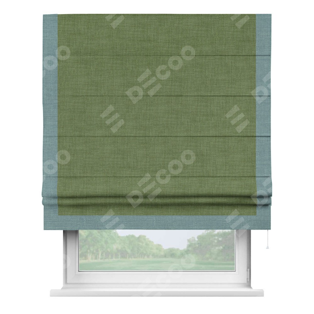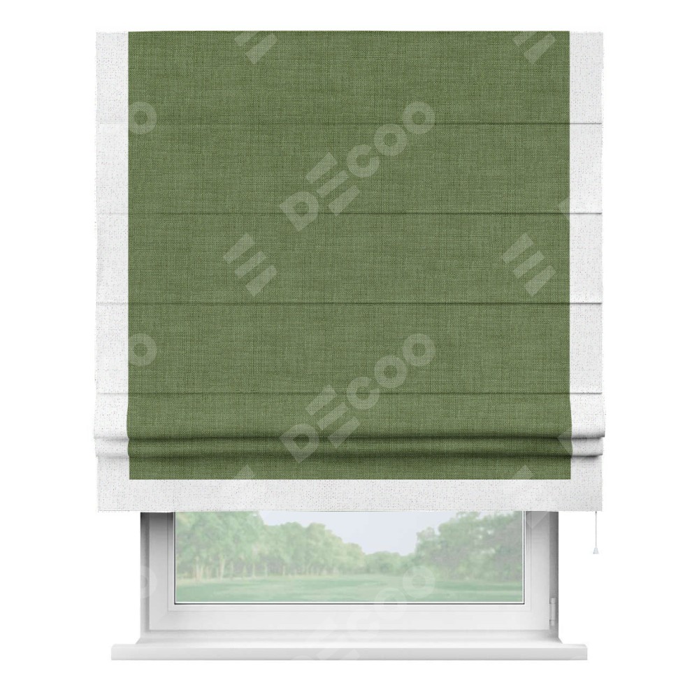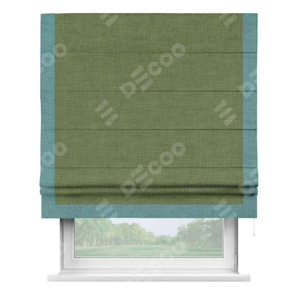 Классическая римская штора производителя «Cortin», пошита из ткани лён зелёный, артикул: 131547. Имеет универсальный механизм и подходит для монтажа: на потолок, на стену и в нишу.