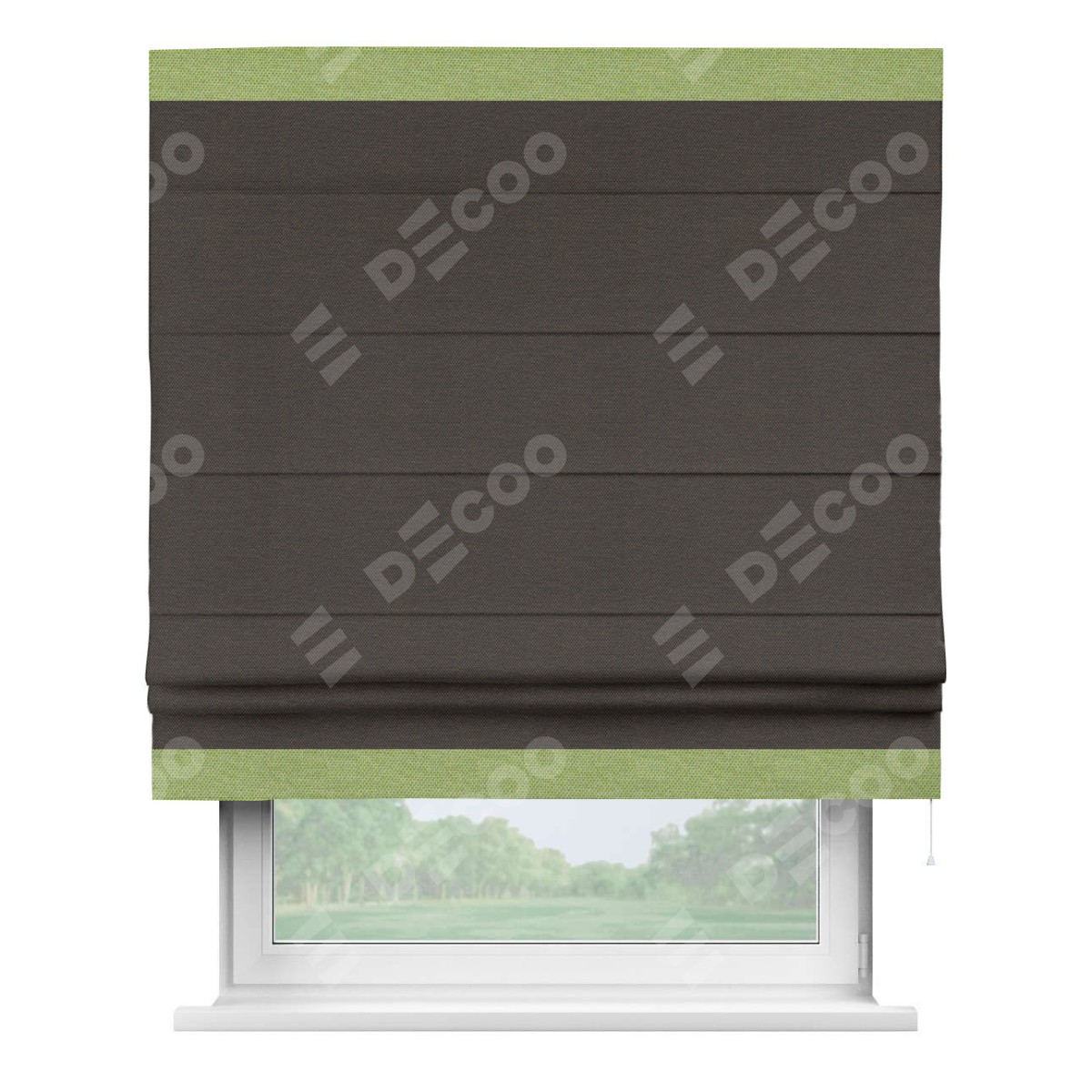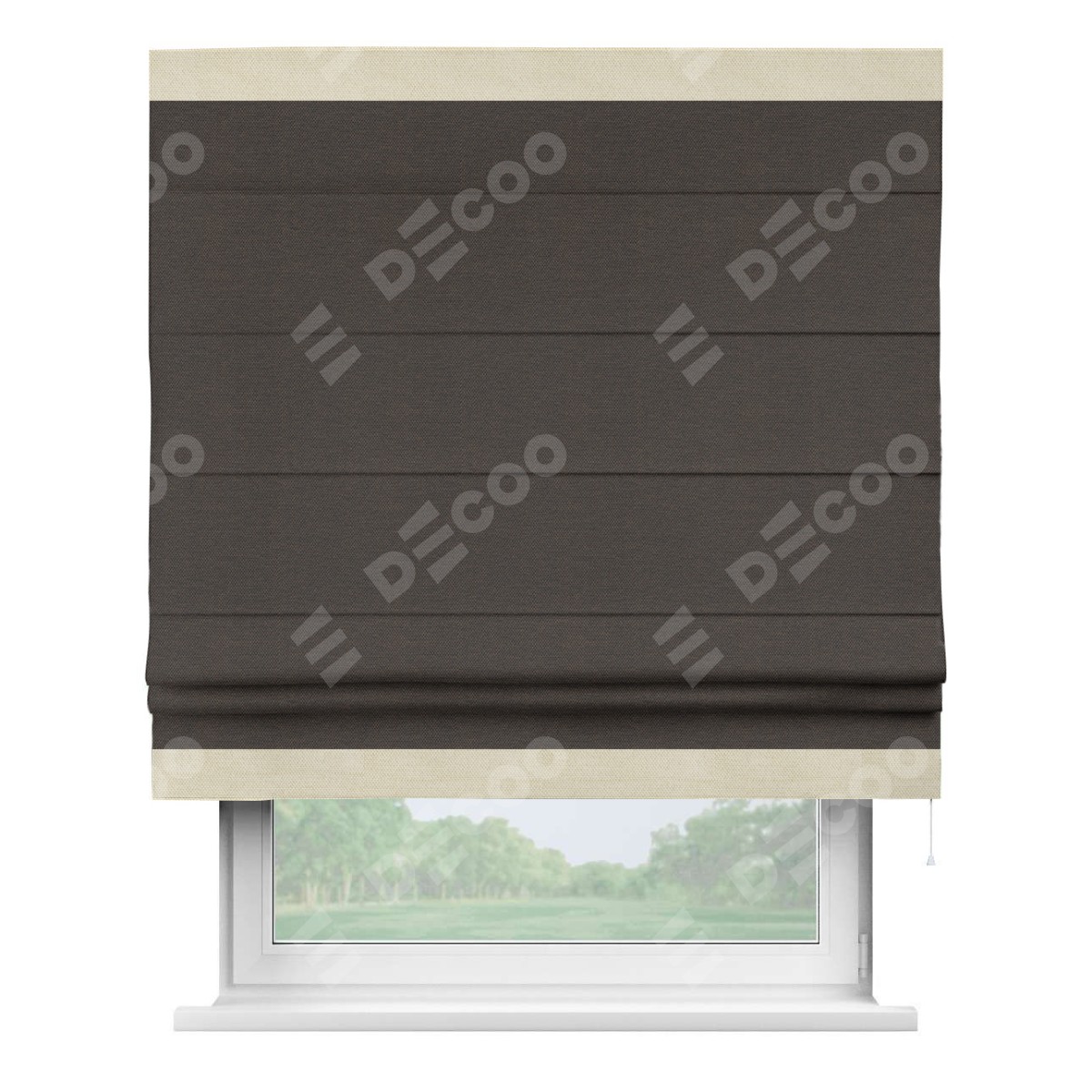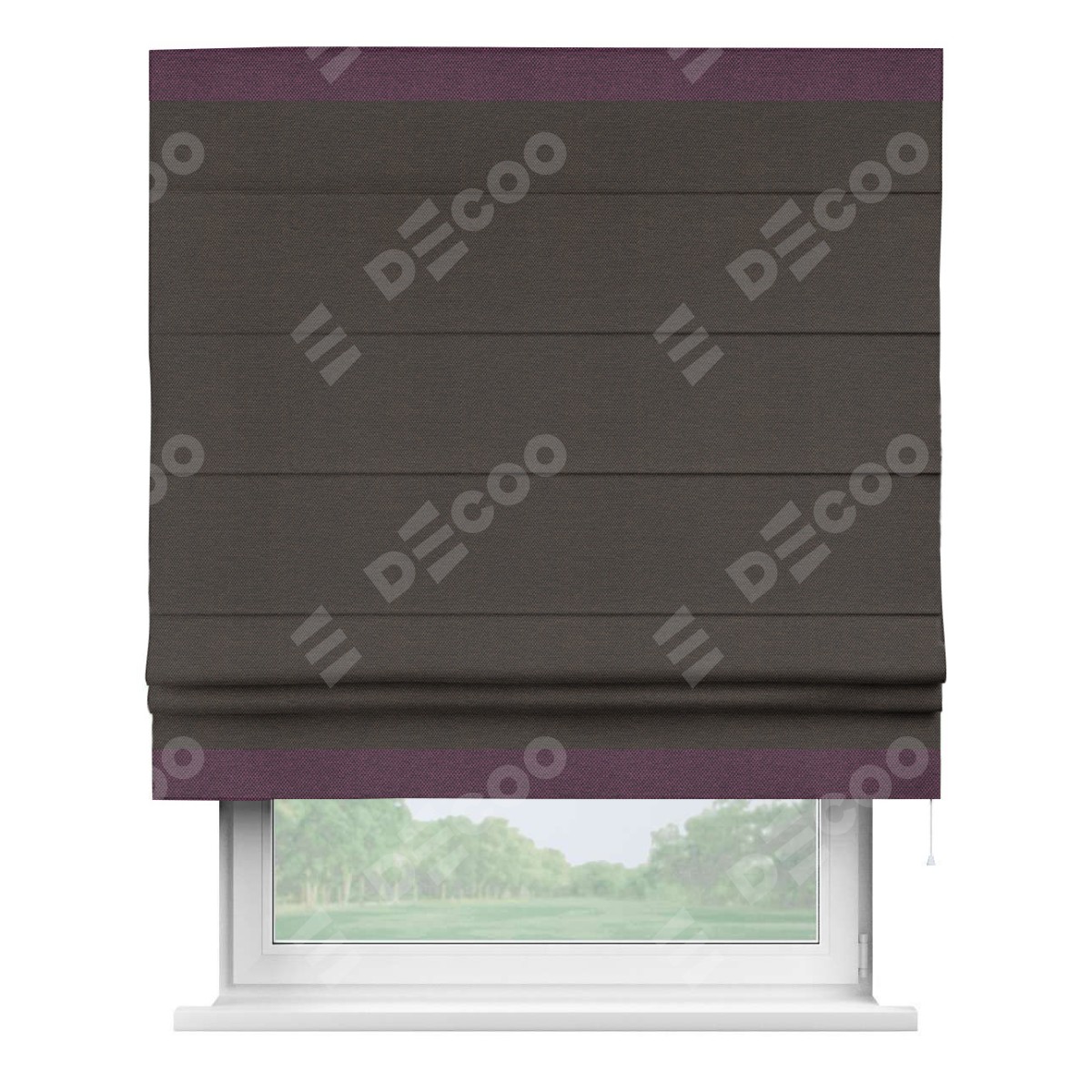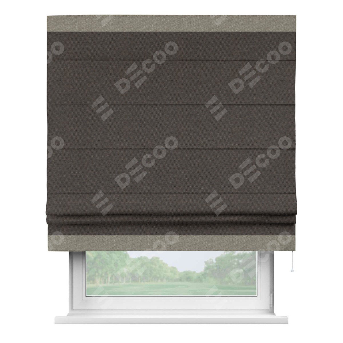 Римская штора производителя «Cortin», используется для проёма, пошита из ткани лён димаут венге, артикул 85410. Отделка шторы кантом «Горизонт», ткань для канта используется из льна димаут разной расцветки на выбор. Имеет универсальный механизм и подходит для монтажа: на потолок, на стену и в нишу.