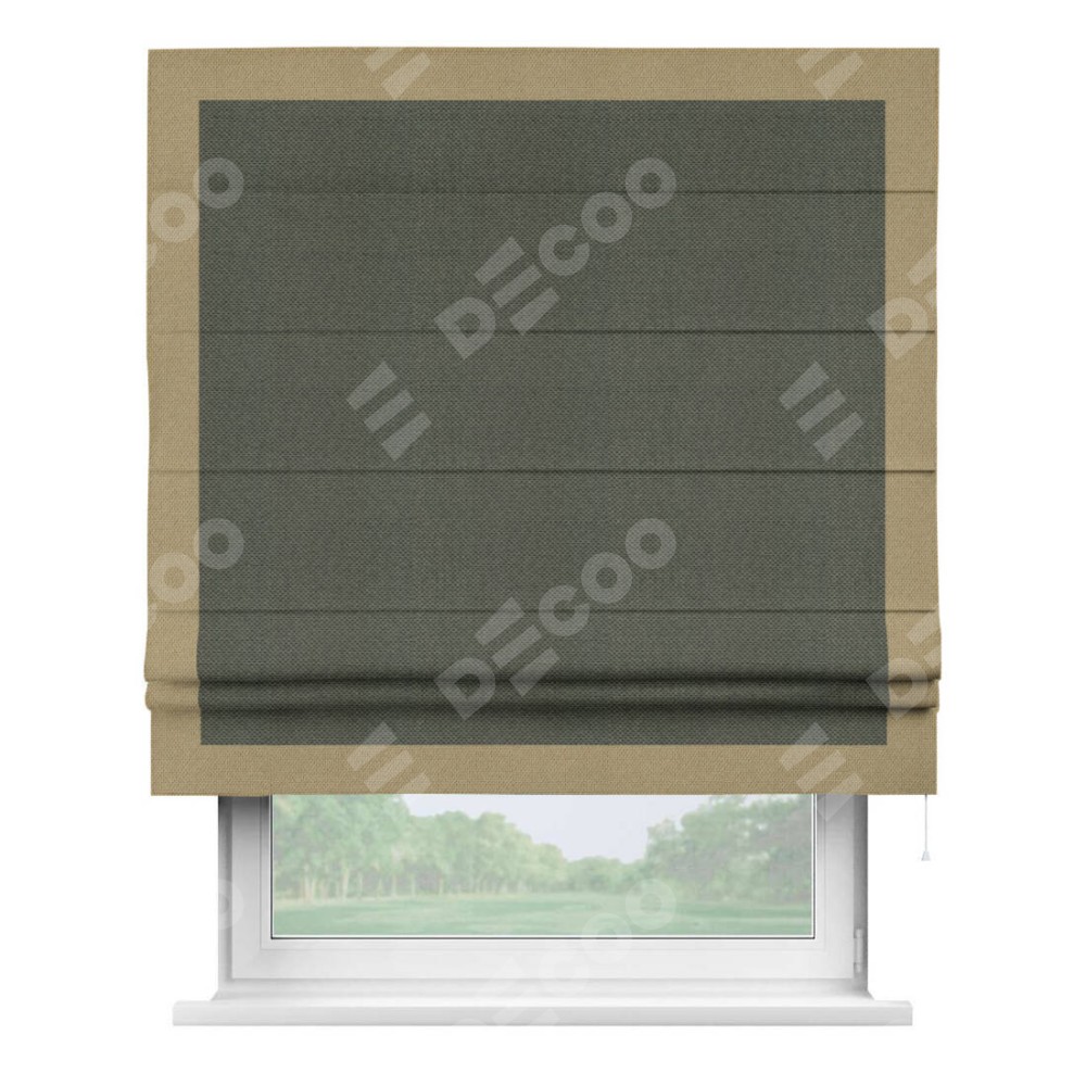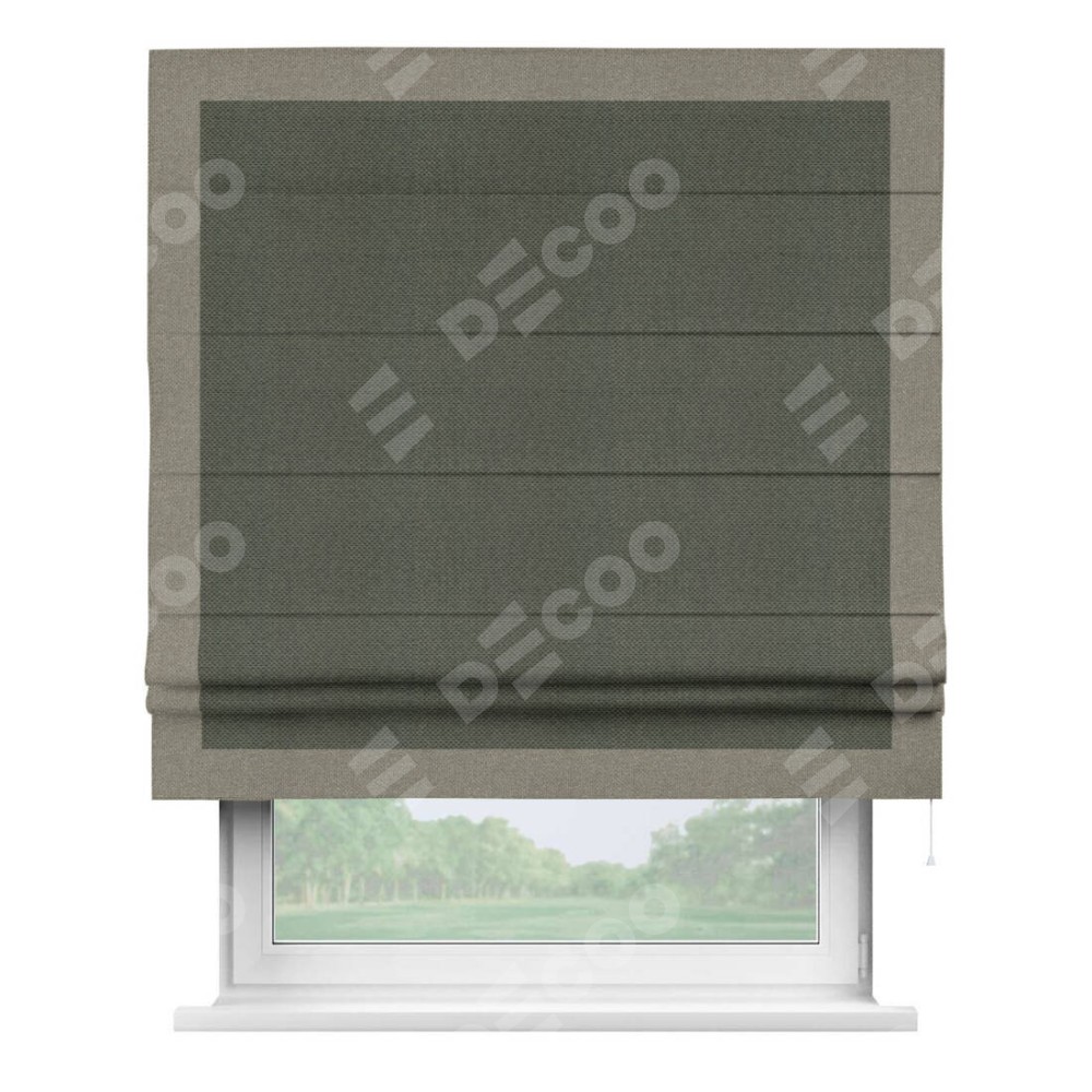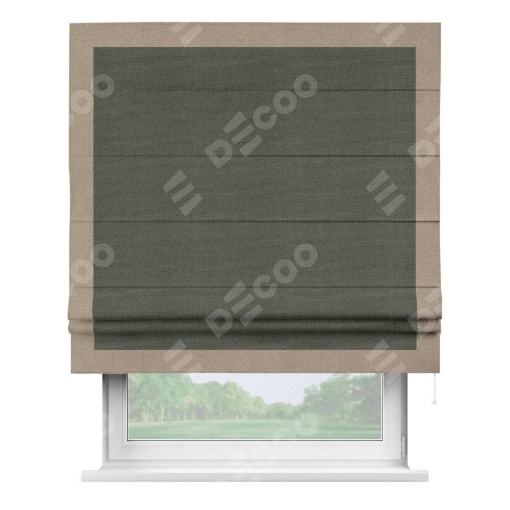 Римская штора производителя «Cortin», используется для проёма, пошита из ткани лён димаут графит, артикул 27. Отделка шторы кантом «Чесс», ткань для канта используется из льна димаут разной расцветки на выбор. Имеет универсальный механизм и подходит для монтажа: на потолок, на стену и в нишу.