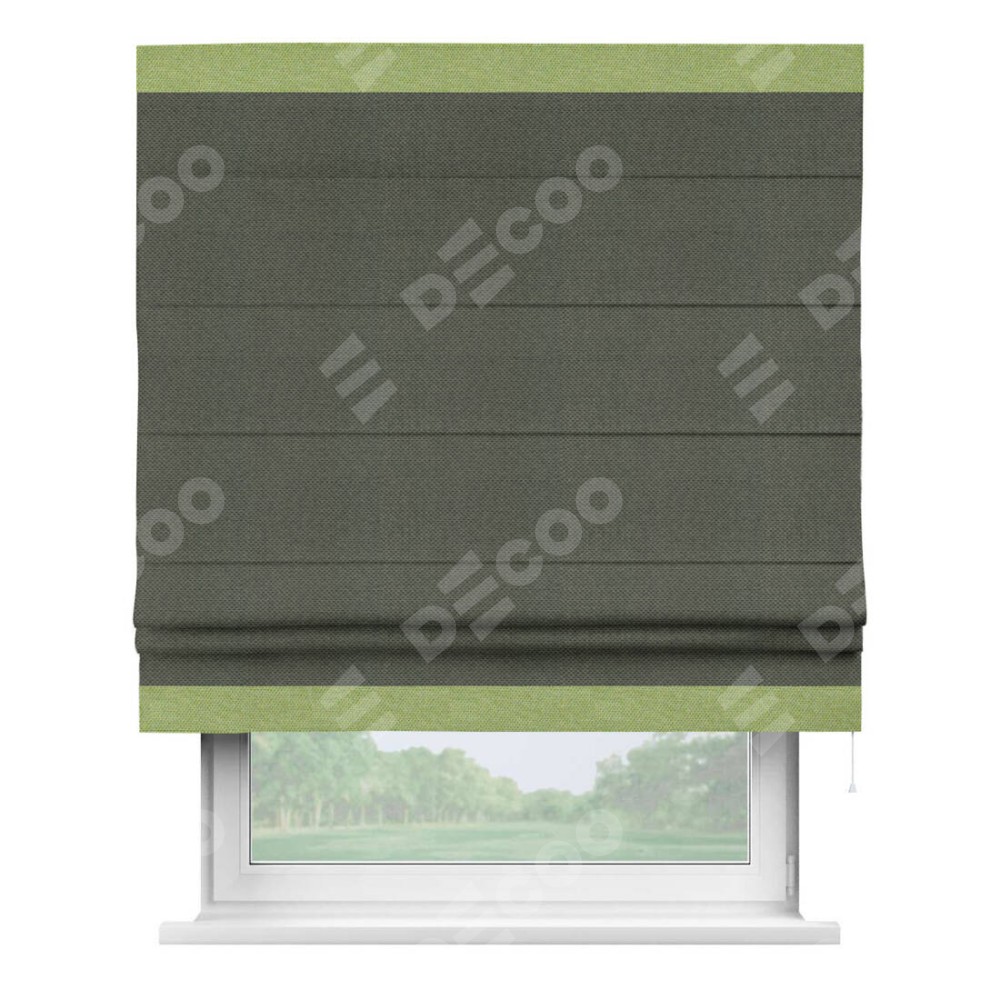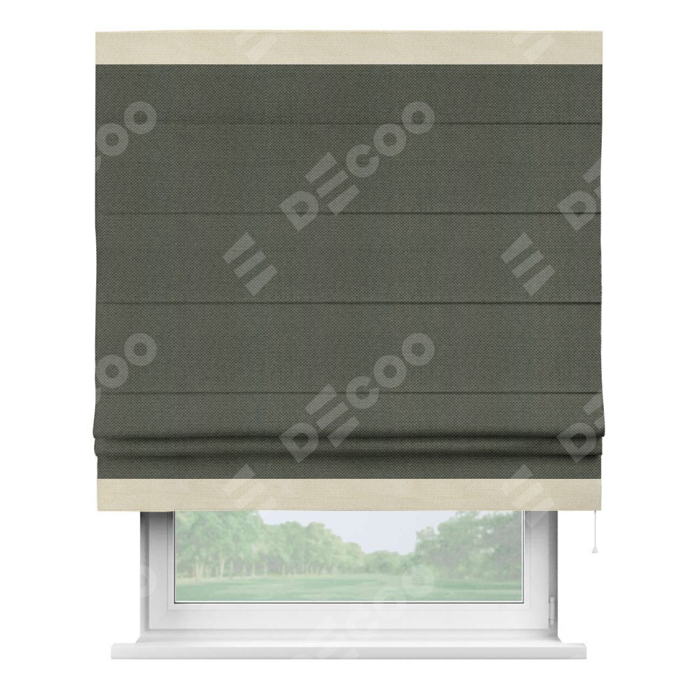 Римская штора производителя «Cortin», используется для проёма, пошита из ткани лён димаут графит, артикул 27. Отделка шторы кантом «Горизонт», ткань для канта используется из льна димаут разной расцветки на выбор. Имеет универсальный механизм и подходит для монтажа: на потолок, на стену и в нишу.
