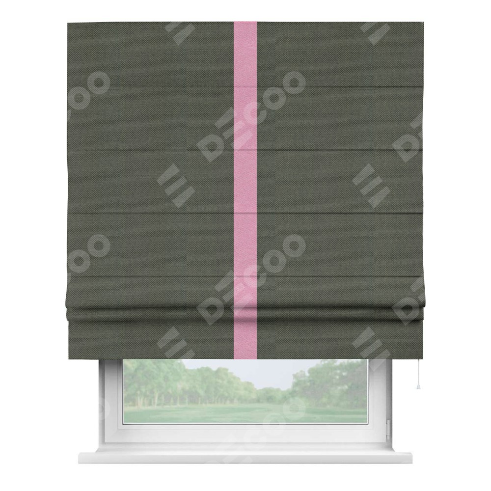 Римская штора производителя «Cortin», используется для проёма, пошита из ткани лён димаут графит, артикул 27. Отделка шторы кантом «Хайвэй», ткань для канта используется из льна димаут разной расцветки на выбор. Имеет универсальный механизм и подходит для монтажа: на потолок, на стену и в нишу.