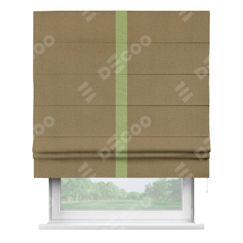 Римская штора производителя «Cortin», используется для проёма, пошита из ткани лён димаут оливковый, артикул 16243. Отделка шторы кантом «Хайвэй», ткань для канта используется из льна димаут разной расцветки на выбор. Имеет универсальный механизм и подходит для монтажа: на потолок, на стену и в нишу.