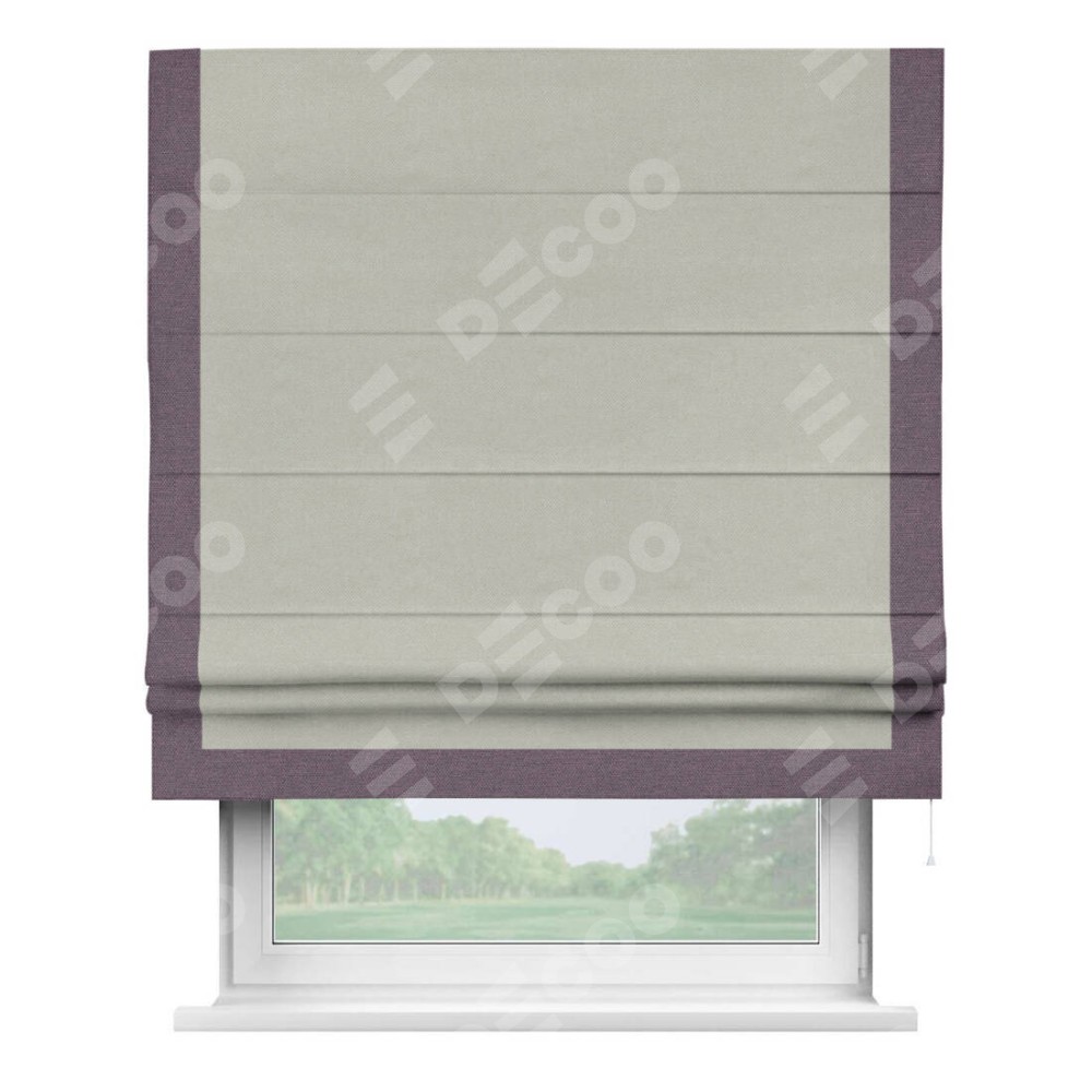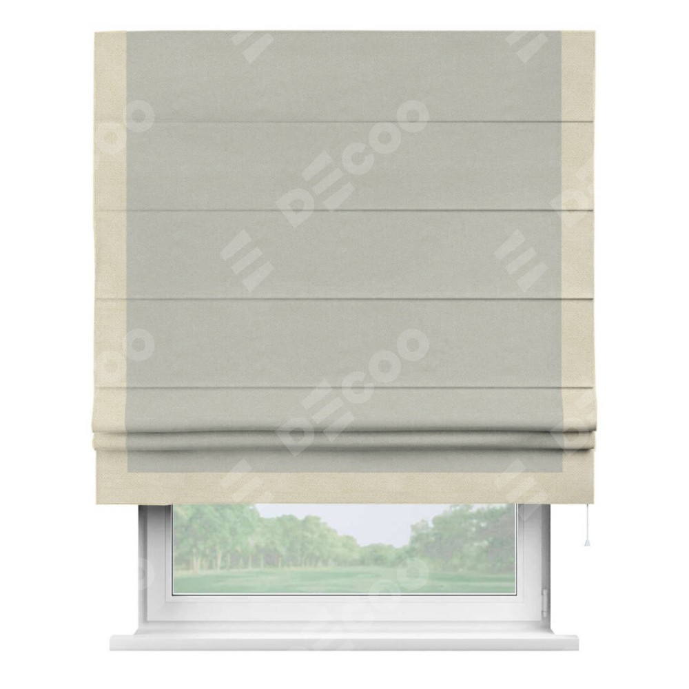 Римская штора производителя «Cortin», используется для проёма, пошита из ткани лён димаут светло-серый, артикул 83025. Отделка шторы кантом «Виктория», ткань для канта используется из льна димаут разной расцветки на выбор. Имеет универсальный механизм и подходит для монтажа: на потолок, на стену и в нишу.