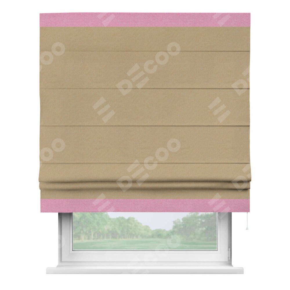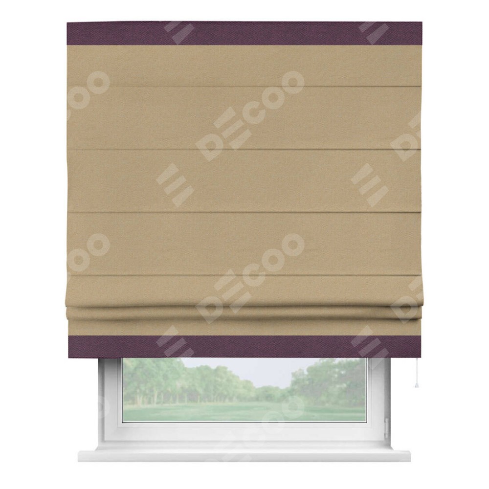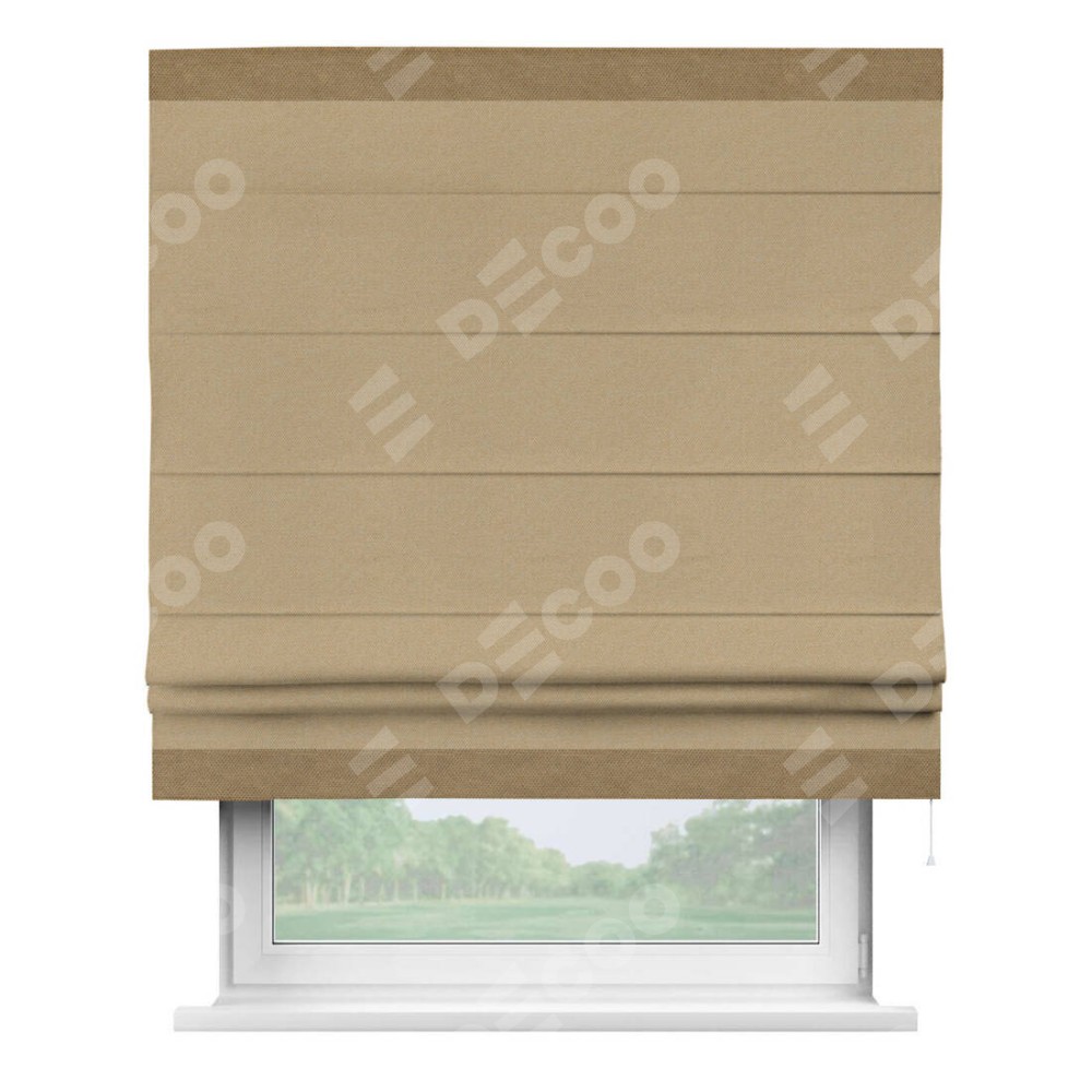 Римская штора производителя «Cortin», используется для проёма, пошита из ткани лён димаут тёмно-бежевый, артикул 83037. Отделка шторы кантом «Горизонт», ткань для канта используется из льна димаут разной расцветки на выбор. Имеет универсальный механизм и подходит для монтажа: на потолок, на стену и в нишу.
