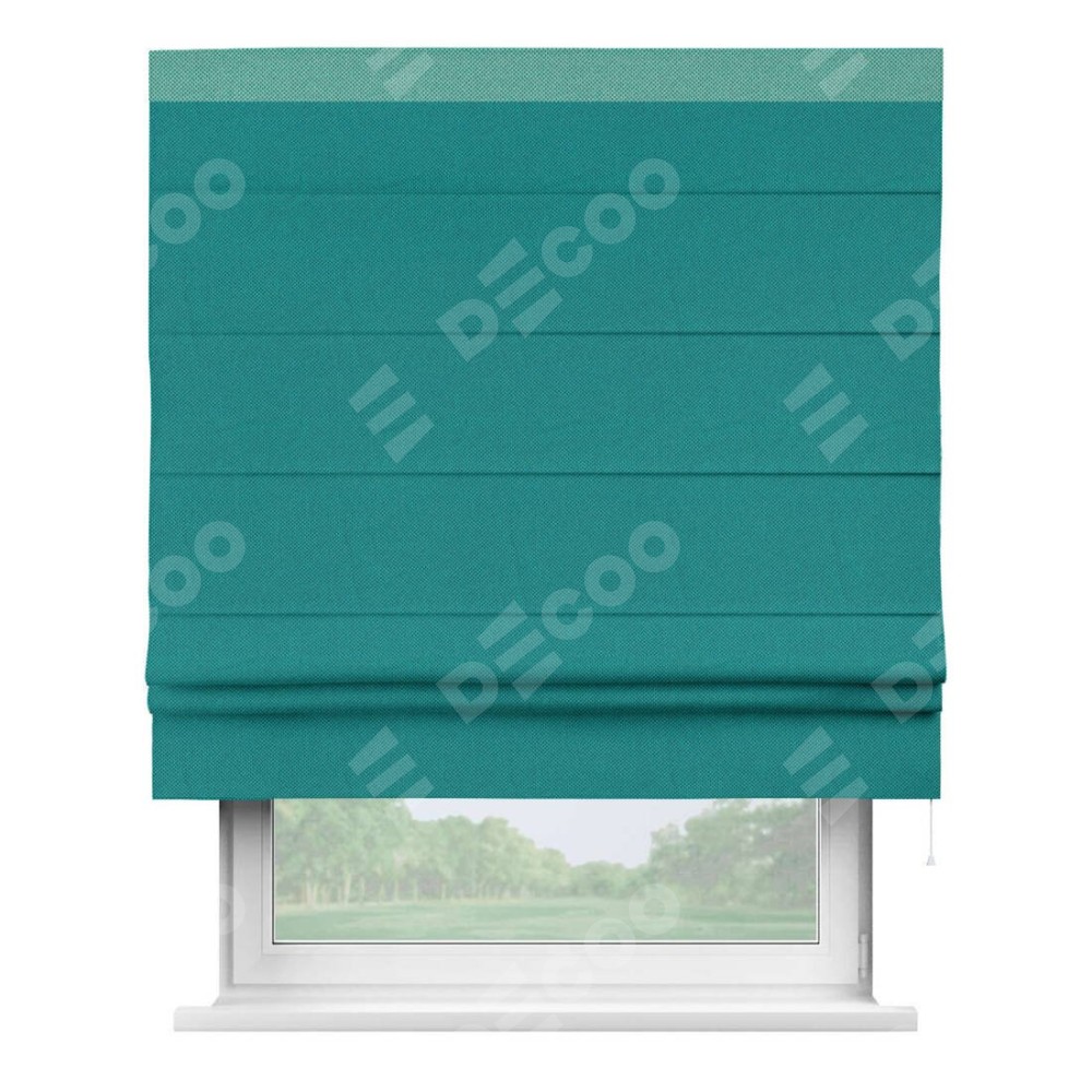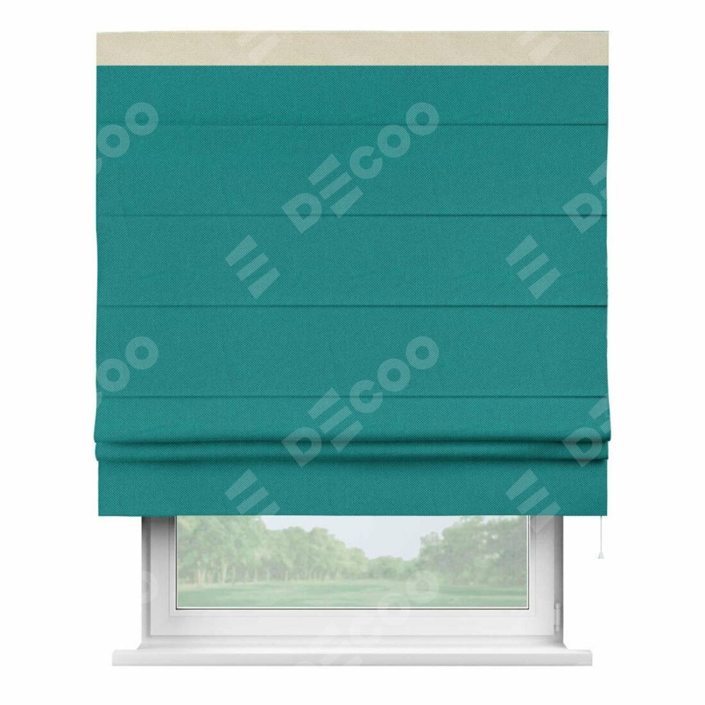 Римская штора производителя «Cortin», используется для проёма, пошита из ткани лён димаут тёмно-бирюзовый, артикул 318. Отделка шторы кантом «Кинг», ткань для канта используется из льна димаут разной расцветки на выбор. Имеет универсальный механизм и подходит для монтажа: на потолок, на стену и в нишу.