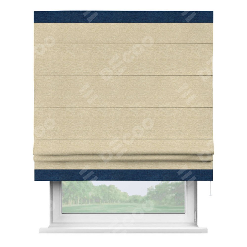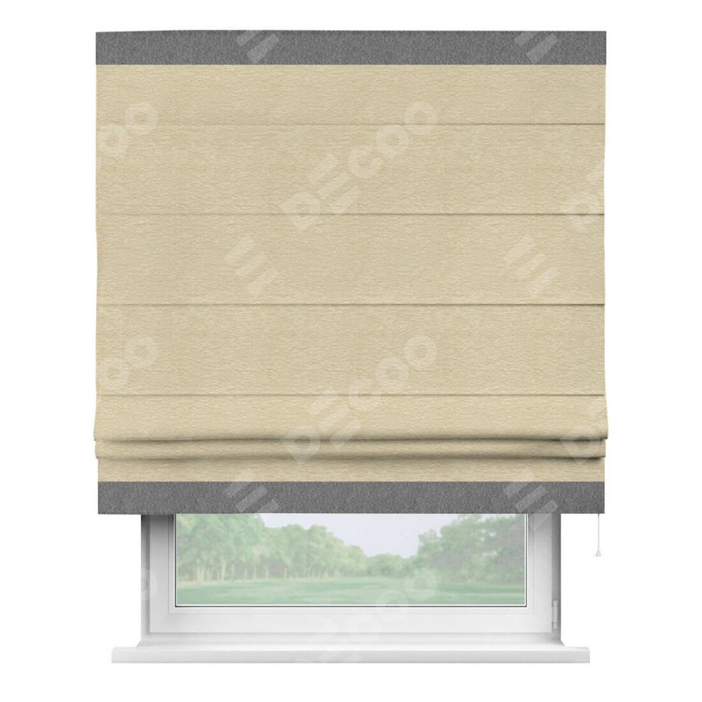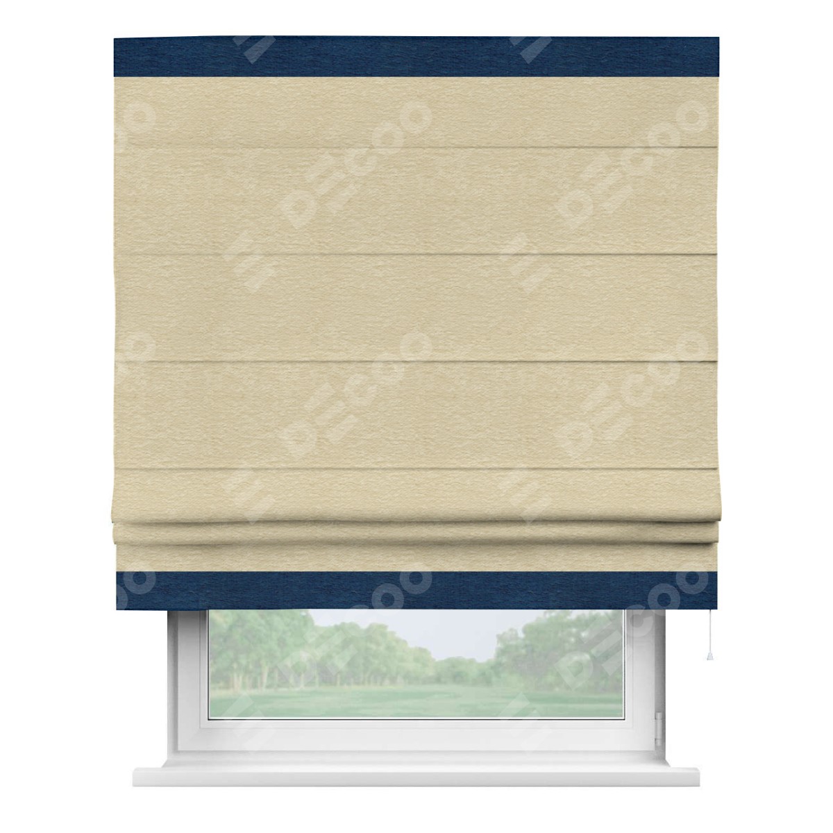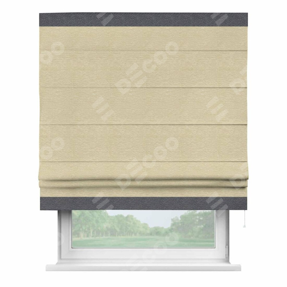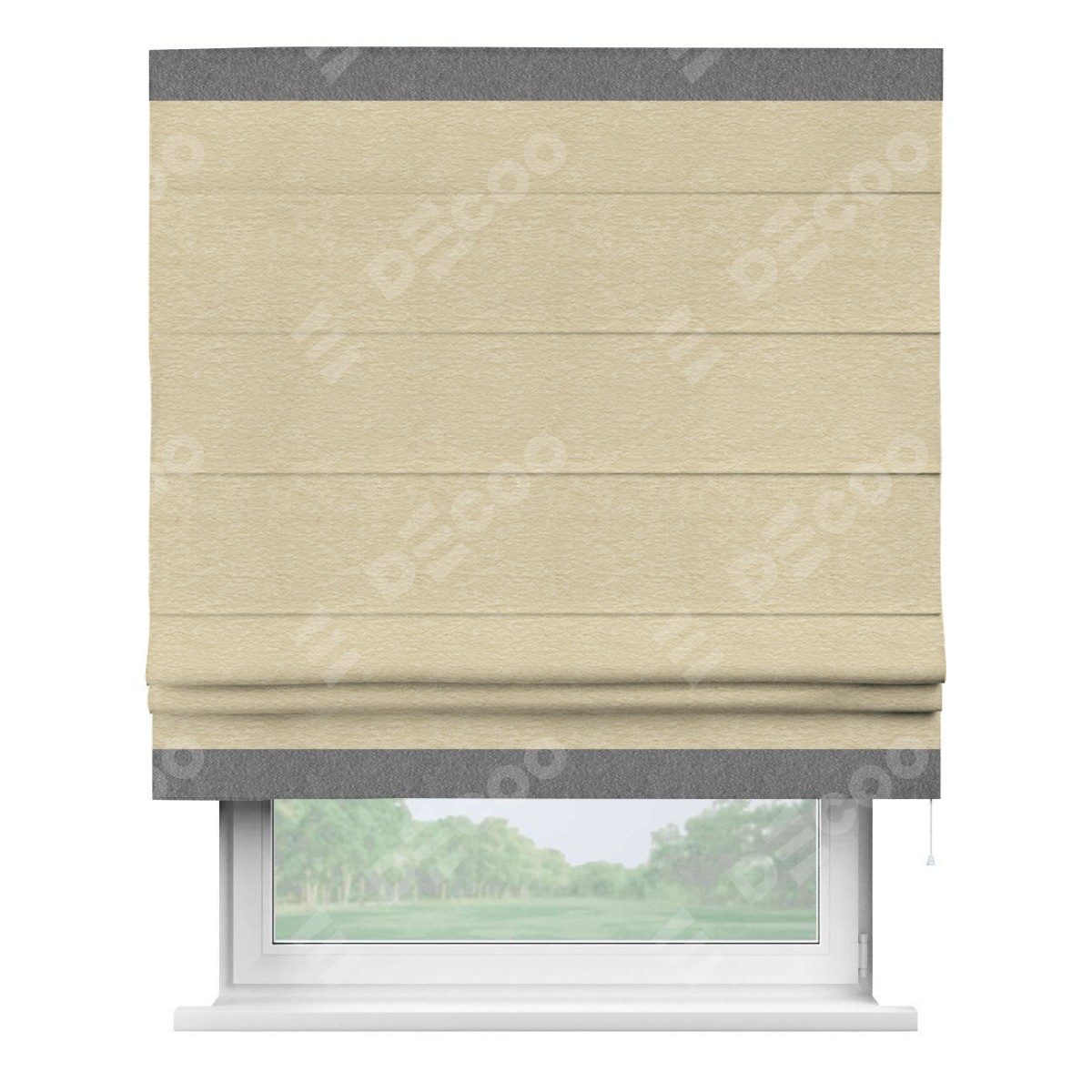 Римская штора производителя «Cortin», используется для проёма, пошита из ткани софт однотонный светло-бежевый, артикул 54426. Отделка шторы кантом «Горизонт», ткань для канта используется из софта разной расцветки на выбор. Имеет универсальный механизм и подходит для монтажа: на потолок, на стену и в нишу.