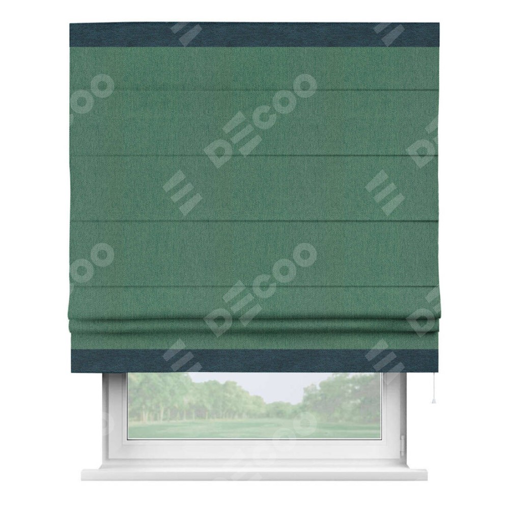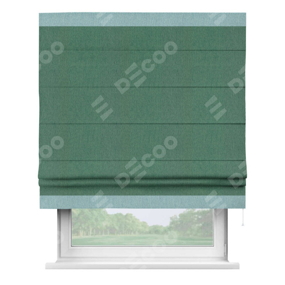 Римская штора производителя «Cortin», используется для проёма, пошита из ткани твид блэкаут зелёный, артикул 21589. Отделка шторы кантом «Горизонт», ткань для канта используется из твида разной расцветки на выбор. Имеет универсальный механизм и подходит для монтажа: на потолок, на стену и в нишу.
