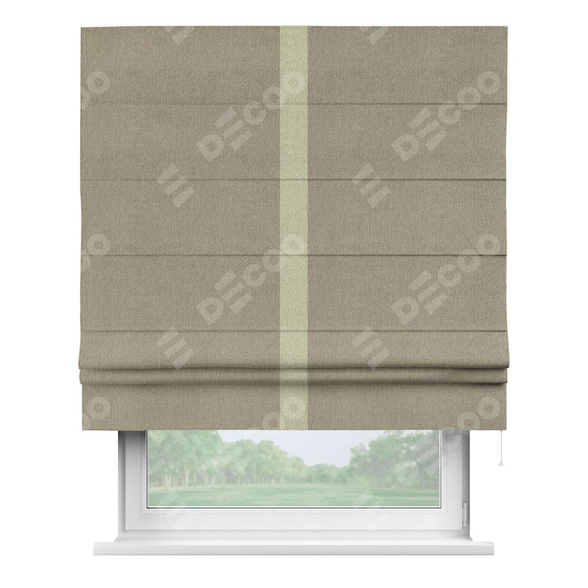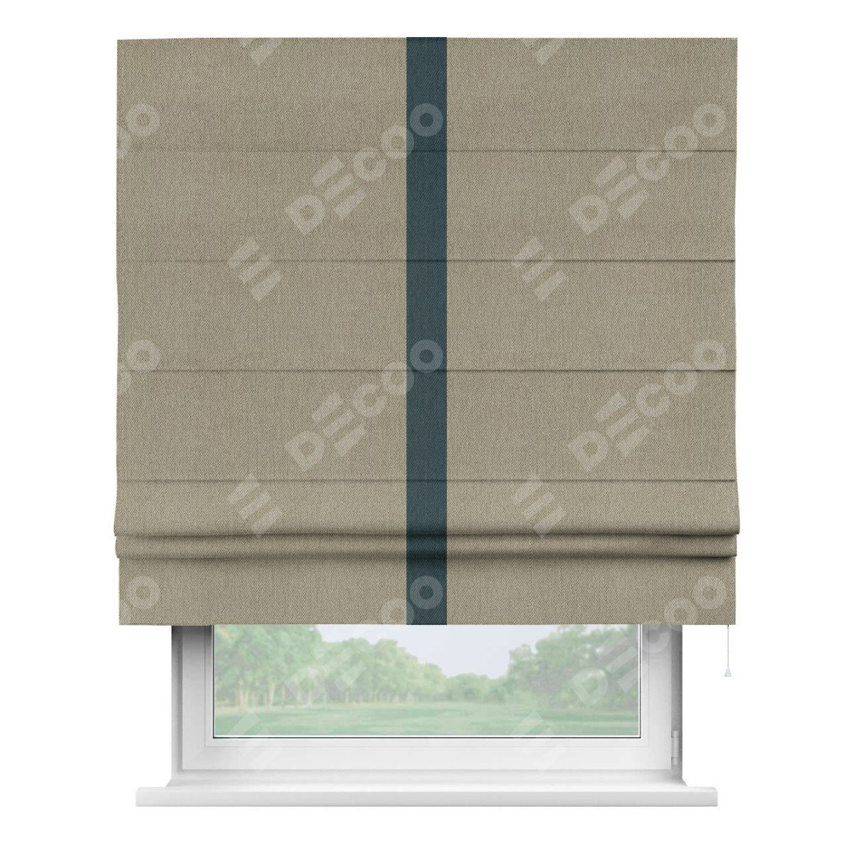 Римская штора производителя «Cortin», используется для проёма, пошита из ткани твид блэкаут кофе, артикул 21575. Отделка шторы кантом «Хайвэй», ткань для канта используется из твида разной расцветки на выбор. Имеет универсальный механизм и подходит для монтажа: на потолок, на стену и в нишу.