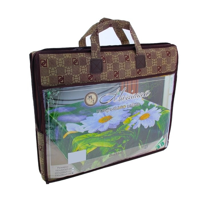 Характеристики: Ткань искусственный шелк, плотность 107 гр/м2, активное (стойкое) крашение. Верх покрывала — набивной рисунок в виде панно, низ — однотонная ткань. Края обработаны шелковой бейкой, упаковка прозрачный чемодан ПВХ с большим вкладышем.