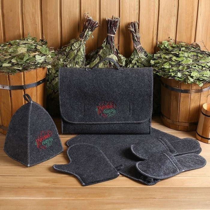 Для комфортного отдыха в парной возьмите с собой набор банных принадлежностей. Предметы из этого комплекта предохраняют тело от перегрева и являются средствами индивидуального пользования. Влажные изделия рекомендуется сушить в расправленном виде на горизонтальной поверхности. Принадлежности из войлока и фетра стирайте вручную при температуре воды 30 °C.